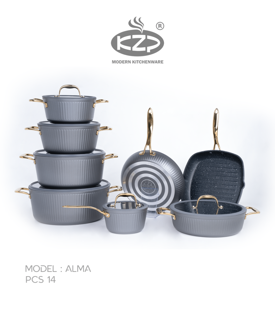 سرویس قابلمه KZP کالکشن آلما ۱۴پارچه درب سیلیکونی رنگ طوسی دستگیره طلایی