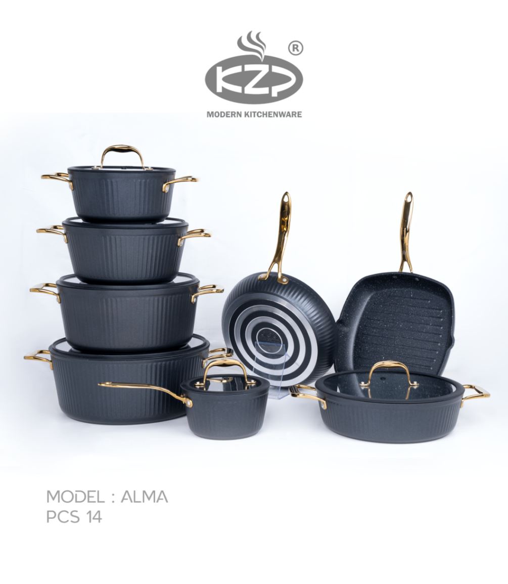 سرویس قابلمه KZP کالکشن آلما ۱۴پارچه درب سیلیکونی رنگ مشکی دستگیره طلایی