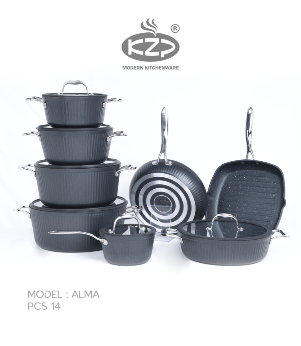 سرویس قابلمه KZP کالکشن آلما ۱۴پارچه درب سیلیکونی رنگ مشکی دستگیره نقره ای