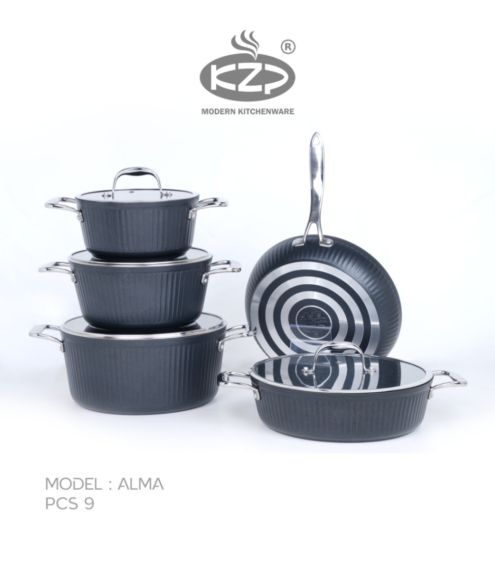 سرویس قابلمه KZP کالکشن آلما ۹ پارچه رنگ مشکی دستگیره نقره ای