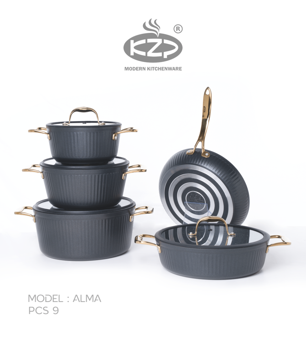 سرویس قابلمه KZP کالکشن آلما ۹ پارچه درب سیلیکونی رنگ مشکی دستگیره طلایی