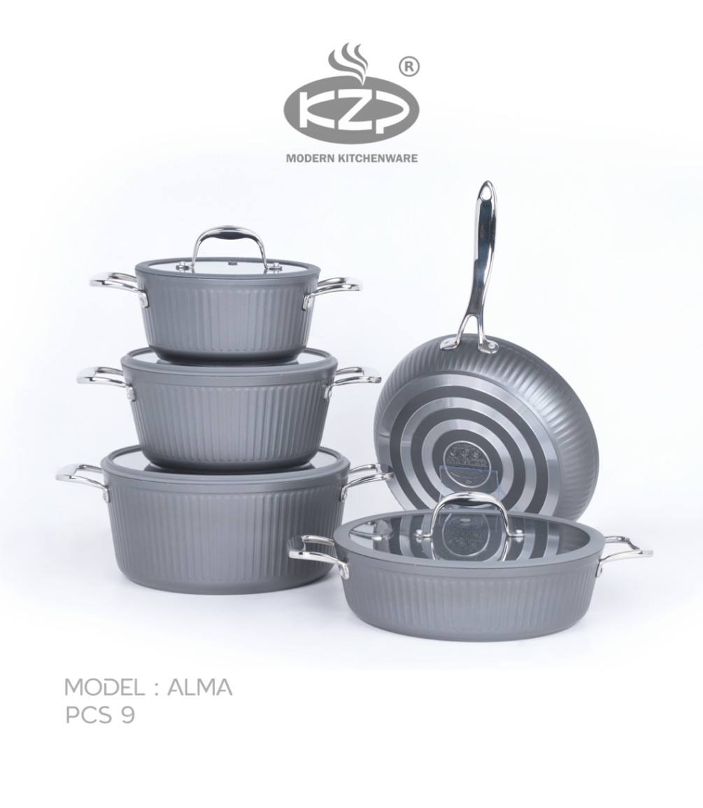 سرویس قابلمه KZP کالکشن آلما ۹ پارچه درب سیلیکونی رنگ طوسی دستگیره نقره ای