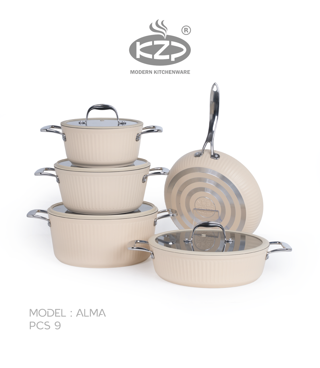 سرویس قابلمه KZP کالکشن آلما ۹ پارچه درب سیلیکونی رنگ کرم دستگیره نقره ای