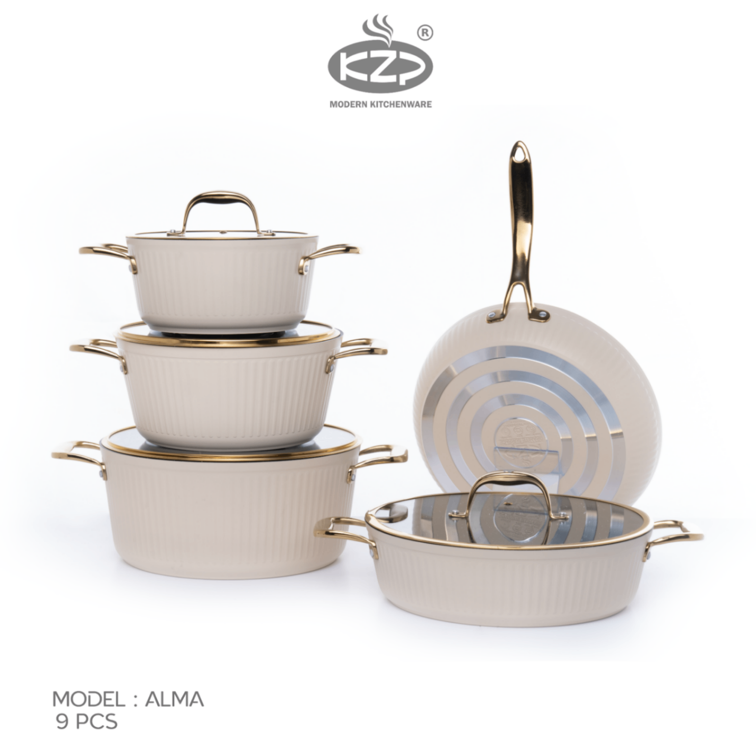 سرویس قابلمه KZP کالکشن آلما ۹ پارچه رنگ کرم دستگیره طلایی