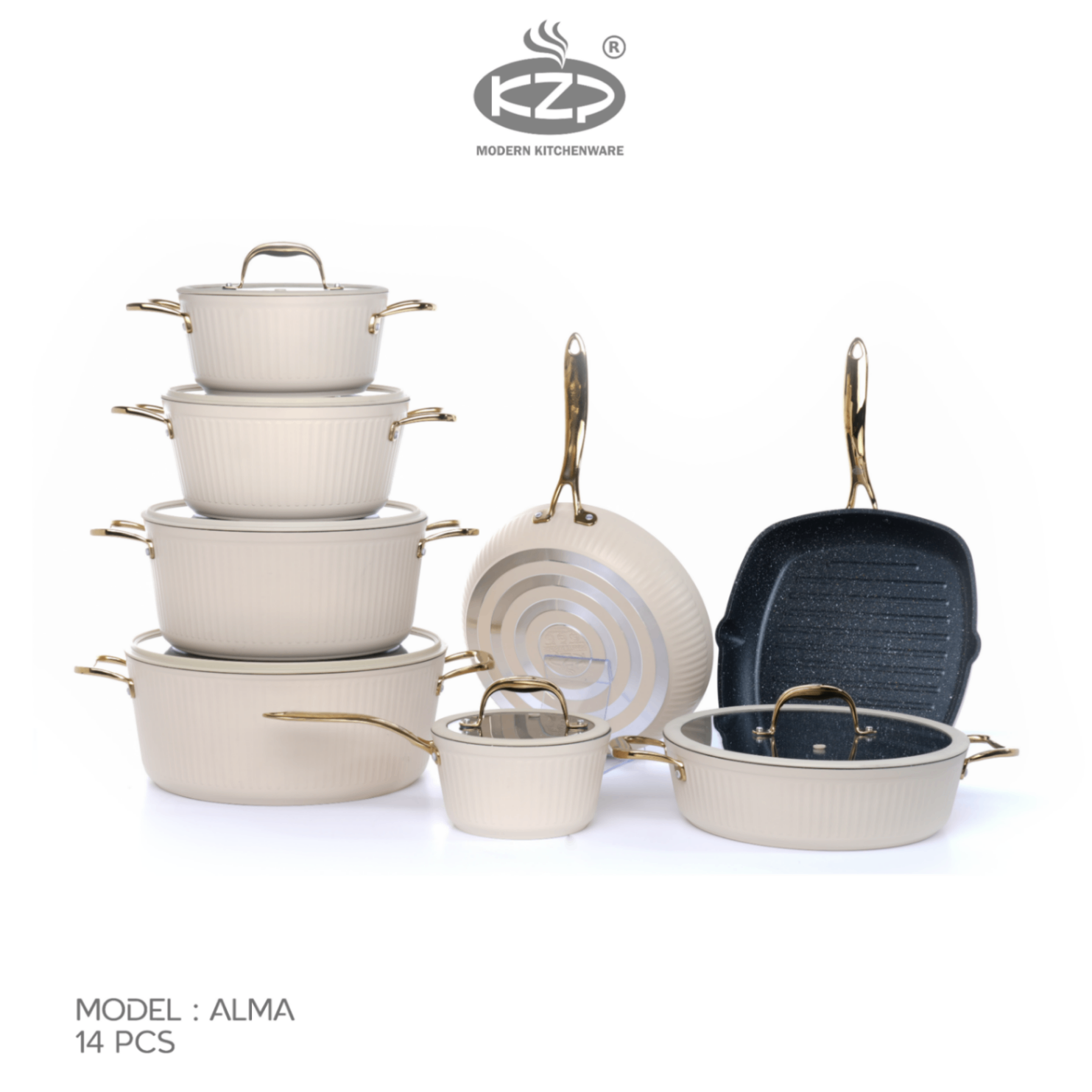 سرویس قابلمه KZP کالکشن آلما ۱۴پارچه درب سیلیکونی رنگ کرم دستگیره طلایی
