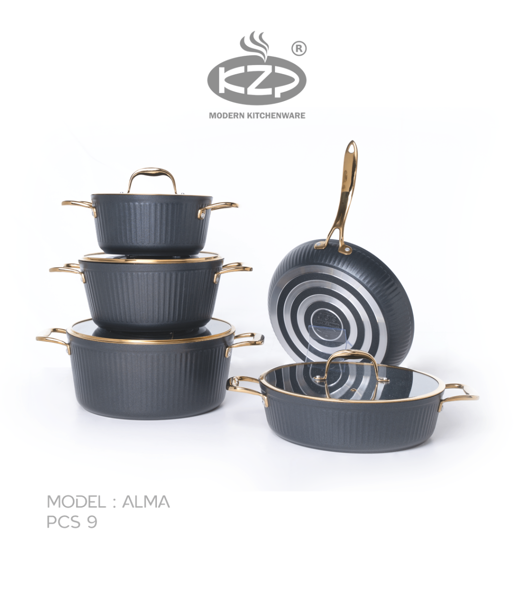 سرویس قابلمه KZP کالکشن آلما ۹ پارچه رنگ مشکی دستگیره طلایی