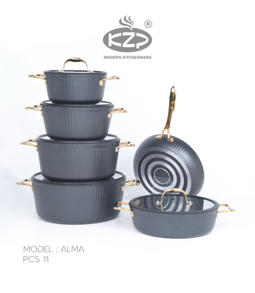سرویس قابلمه KZP کالکشن آلما ۱۱ پارچه درب سیلیکونی رنگ مشکی دستگیره طلایی