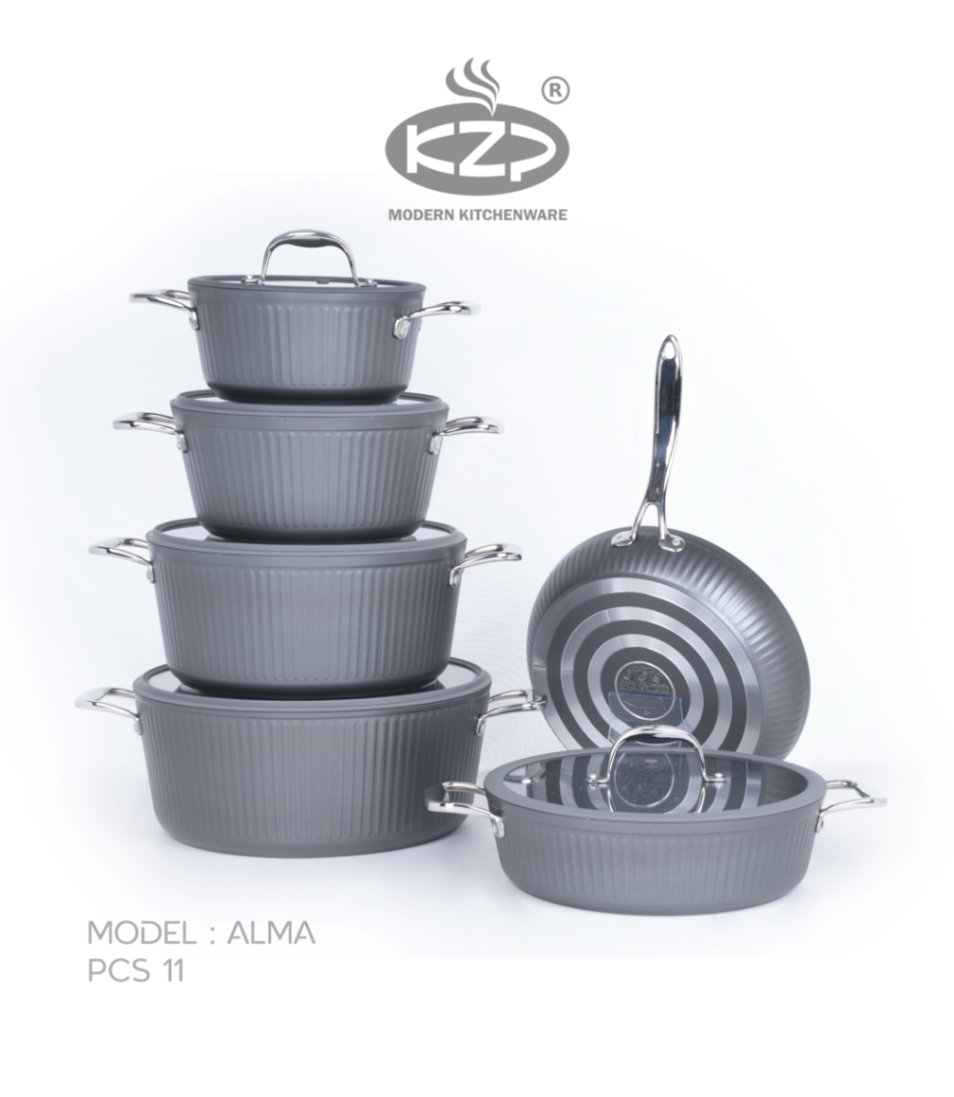 سرویس قابلمه KZP کالکشن آلما ۱۱ پارچه درب سیلیکونی رنگ طوسی دستگیره نقره ای